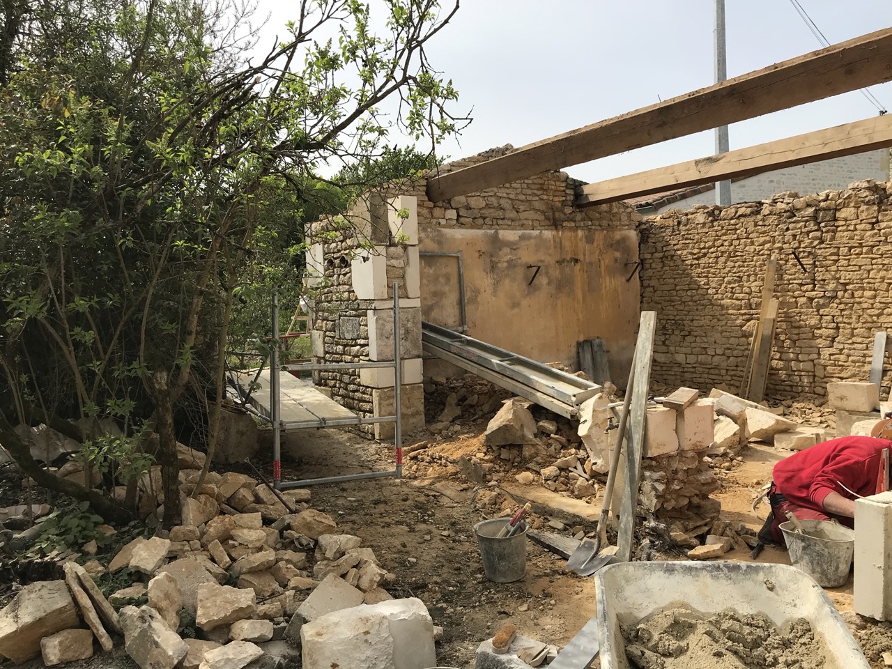 Les murs d’origine, fragilisés par le temps, ont été entièrement repris en moellons. Ce matériau, typique de l’architecture locale, assure à la fois la solidité et l’esthétique du bâti. Nos maçons ont veillé à respecter l’appareillage traditionnel afin que la restauration s’intègre harmonieusement dans son environnement.